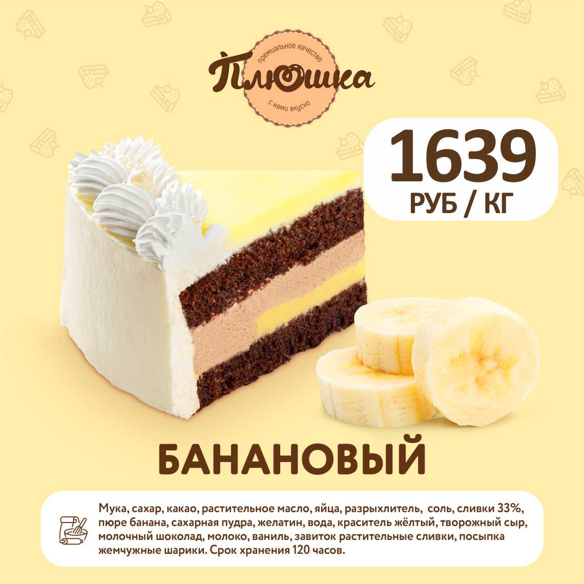 Мука, сахар, какао, растительное масло, яйца, разрыхлитель, соль, сливки 33%, пюре банана, сахарная пудра, желатин, вода, краситель жёлтый, творожный сыр, молочный шоколад, молоко, ваниль, завиток растительные сливки, посыпка жемчужные шарики.